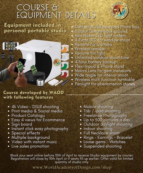 The course will be conducted online with a specially developed 21-item studio kit for designers' complete Jewellery and Gemstone photography. Click here to claim this offer or Visit https://www.worldacademyofdesign.com/shop